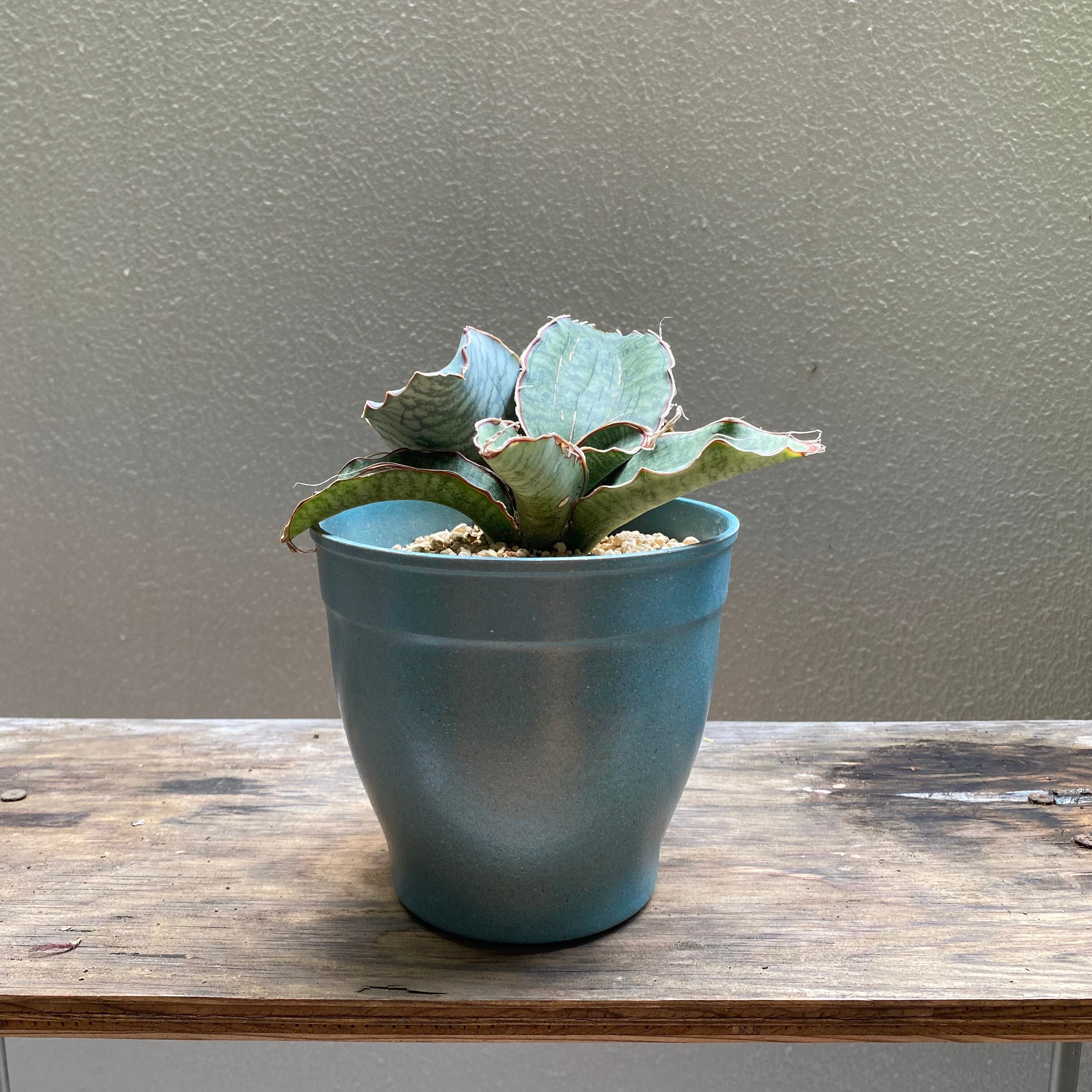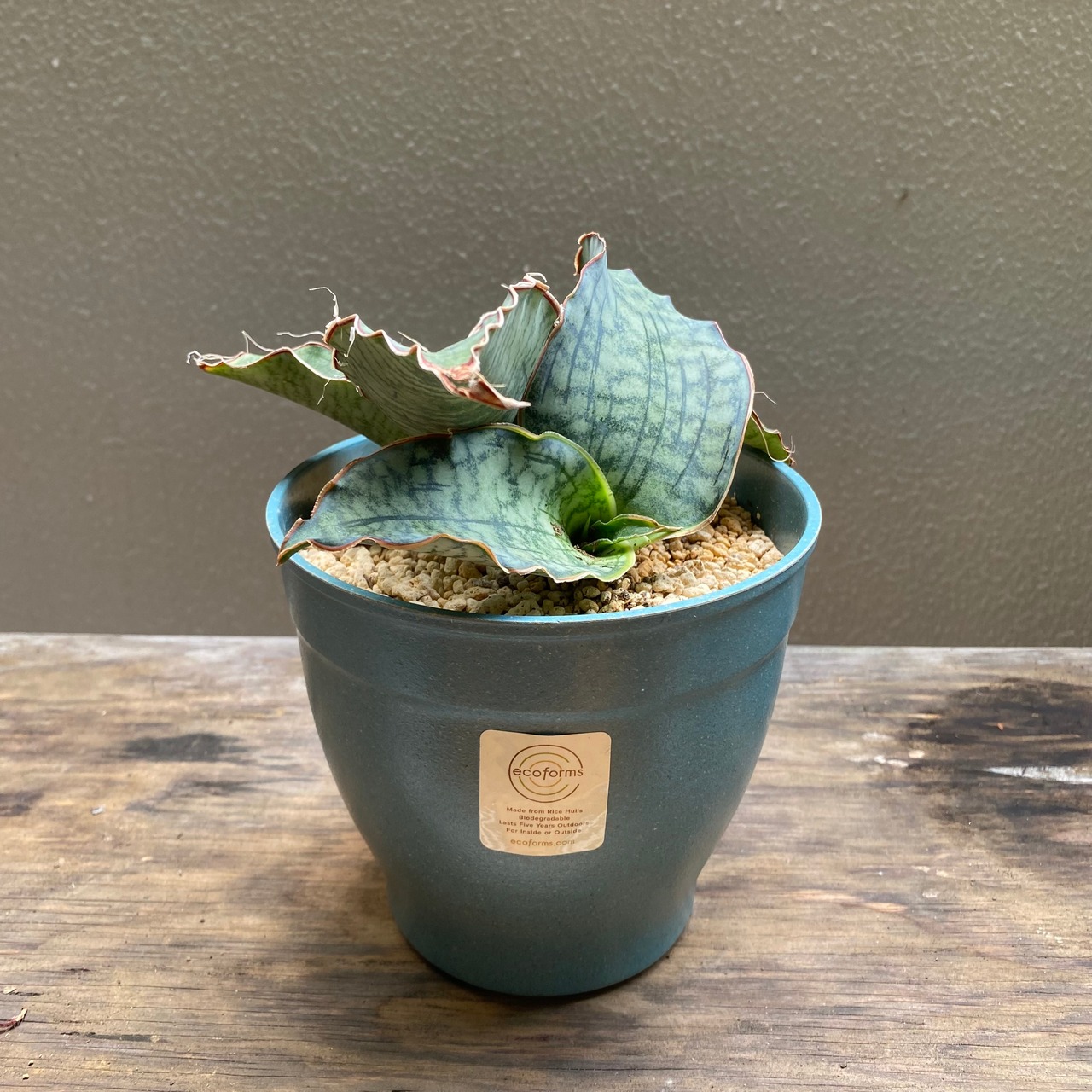 不規則にウェーブのかかったシルバーブルーの葉に赤っぽい縁取りが美しいサンセベリア 'シルバーブルー'。